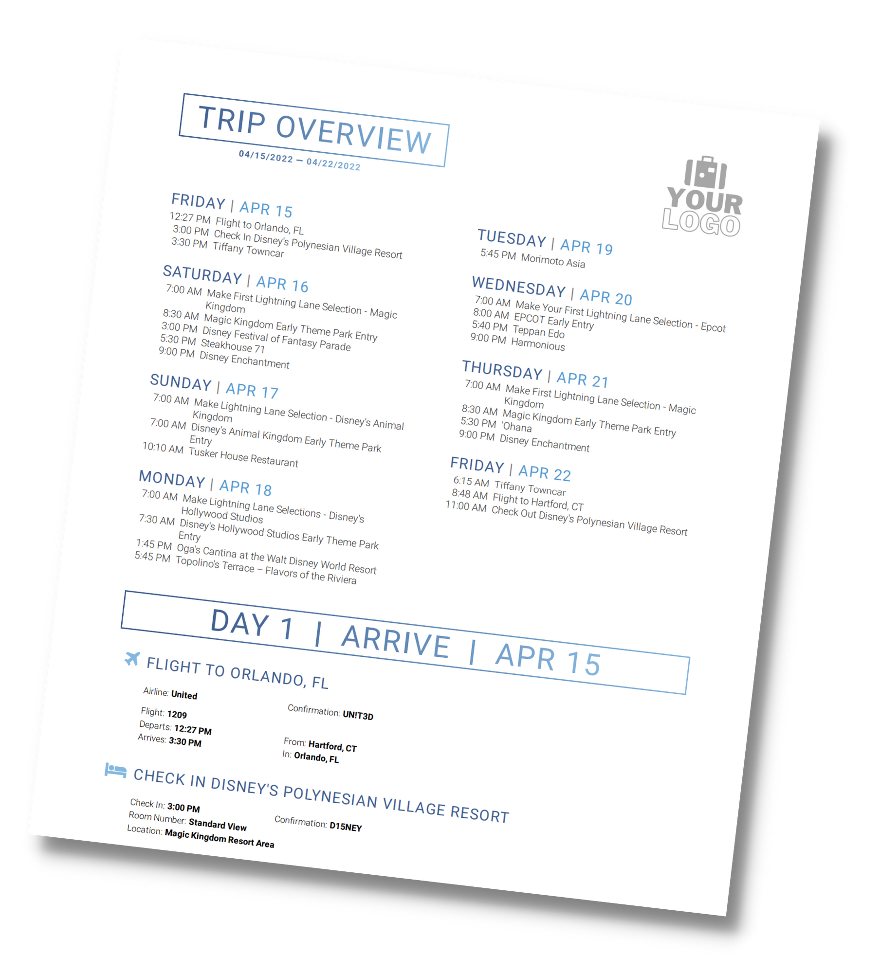 Having a concise itinerary is priceless - having a clear and distinctive layout keeps them in the magic.